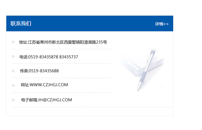 傳真:0519-83435688    郵編:213135    網(wǎng)址:WWW.czjhgj_com.gdcld.com    電子郵箱:JH@czjhgj_com.gdcld.com